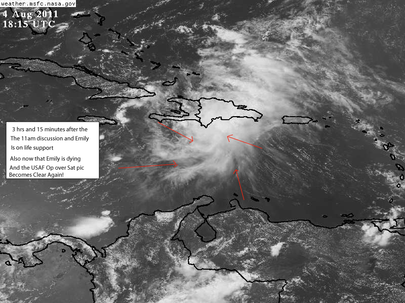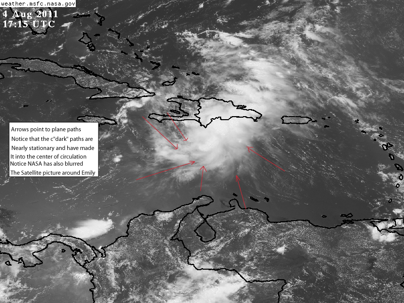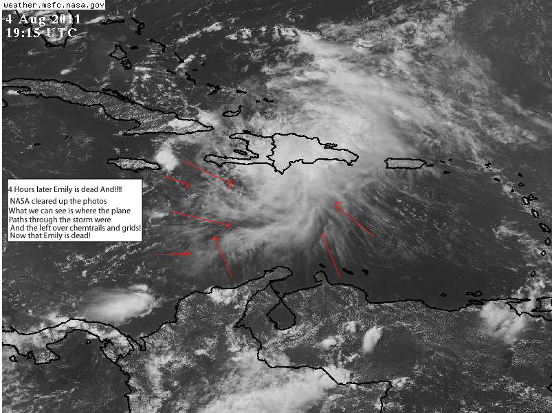 Let’s look 4hours and 15 minutes later at 19:15UTC or 3:15pm. Ahhhhh… Emily is dead and at 5pm the NHC agrees. Their explanations as quoted from above. The mountains disrupted it. Funny… the mountains exist over open ocean? Because that’s where we noticed the paths through the clouds began, over the Caribbean Sea, not over the mountains of Hispaniola. The blurring of satellite pictures over Emily when the USAF was conducting it’s hurricane operations? Gee…it was all just nature and geography that killed this one. Especially those large mountains over the Caribbean Sea!!!!