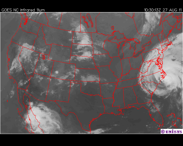 Here's the satellite picture beginning Saturday Morning and ending Saturday Night. What we see across most of West Virginia, Southwestern VA, Western NC and SC are the exact signatures seen in Ophelia in 2005 that helped make it a half a hurricane. Compare those signatures to the ones over MD,VA,NC for Ophelia. They are identical. Watch as these signatures work their way into Irene's circulation center again and then aha! Distruction of Irene and Irene never recovered it's southern half of the circulation again.