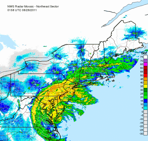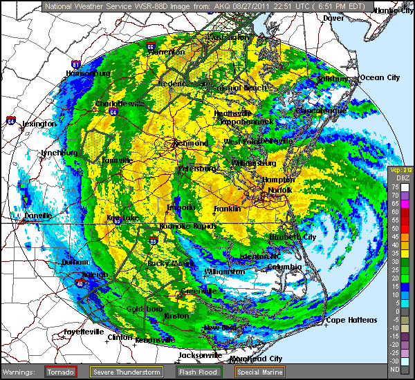 Irene gained strength over NC due to two reasons, the first being the lack of new chemtrails being brought into Irene's circulation center. And two with out those new chemtrails it's southern and eastern circulation center was over the warm waters of NC grabbing moisture and energy. During the evening of August 27 Irene had pretty much closed the gap with its circulation center and was bound for re-strengthening...and then ooops. More chemtrails worked their way into the south and east quadrant of Irene. Radar of Irene re-entering the Atlantic.