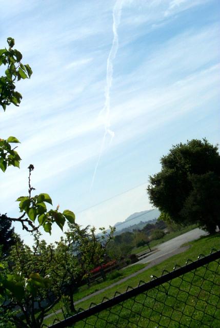 The United States is currently in a critical drought that started in September 2001, in the same month of the World Trade Center attacks. Since that time there has been an enormous increase of chemical trail activity reported by citizens across the United States. At the same time the amount of commercial aircraft flights has decreased significantly. On pages 7 and 8 there are time lapse photos of a contrail passing underneath cirrus clouds, and leaving nothing behind, that is an example of a contrail as the condensed water evaporates. The trails shown in the photo section of this paper show otherwise. The trails are long and wide, very uncharacteristic considering the moisture left behind by a contrail is limited. In San Jose, California, Tony Diconza took this picture on April 11,2002, from his back yard, of a chemical trail spraying device breaking from the plane and going in a different direction. The trail left behind the plane is clearly a chemical trail, and if it was a contrail the plane would have met its fate because that would be the engine going in a different direction. There were no reports of a plane crash that day in California.