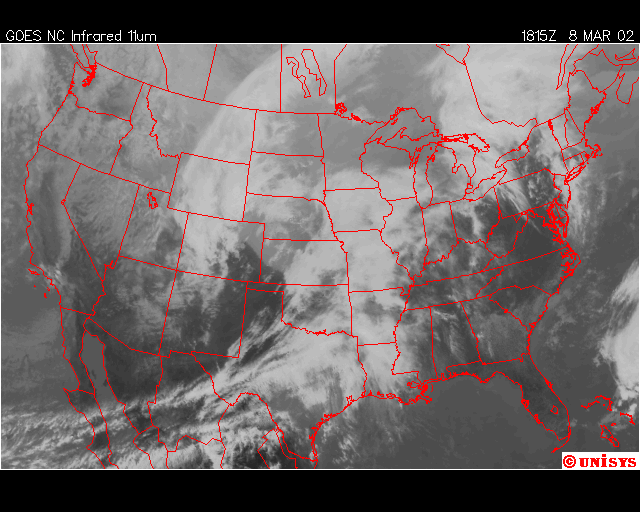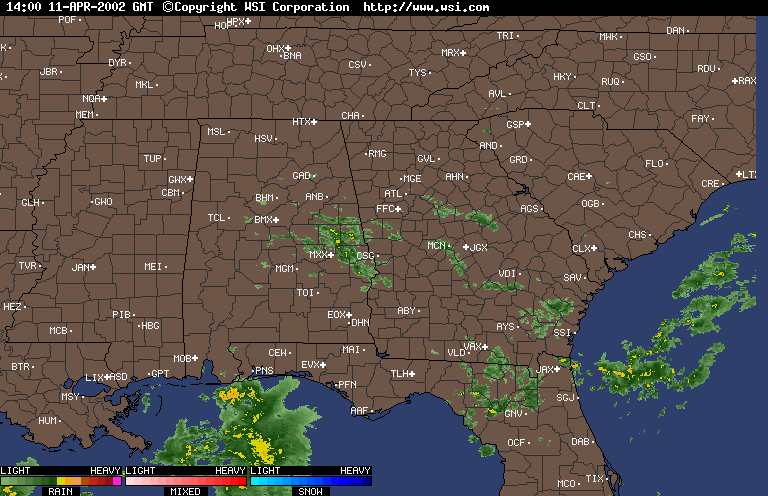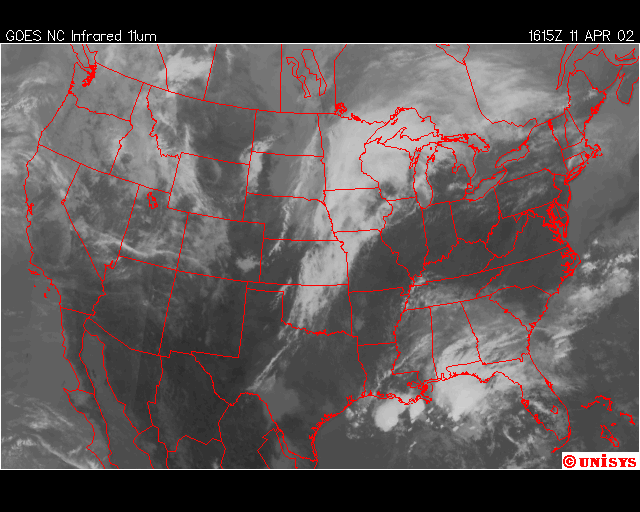Finally, over Southeastern United States on the afternoon April 11,2002, an upper level low near Lousiana is setting off numerous showers and thunderstorms across the region. Everywhere from Eastern Texas to South Carolina recieved rain from this event that day,except Southwern Georgia. In Southwestern Georiga, the Chemical Trails where evident on the Satliette pictures. The area that was sprayed with Chemical Trails did not recieve any rain from this event for April 11,2002.